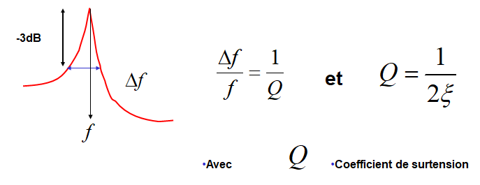 • Ces paramètres évoluent en fonction de la fréquence, la structure étant composée de masse raideur amortissement des résonances apparaissent cela veut dire que l'on a une fréquence loin de la résonance et qu'il peut y avoir un niveau proche de zéro et à la résonance une amplification du niveau. Ceci est appelé le coefficient de surtension Q.