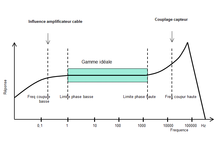 • Cas de l’accéléromètre : le principe général est qu’une petite masse vient compresser donc exciter une cellule, soit piézoélectrique, piezorésistive ou capacitive et le signal électrique est alors proportionnel à l’accélération du fait de la loi de la dynamique, mais la masse M et la raideur K de la cellule génère une résonance qui filtre les hautes fréquences avec une fréquence de coupure lié à F = √K/M et l’électronique de conditionnement génère une filtre qui supprime les basses fréquences (passe haut) donc chaque accéléromètre doit être utilisé en fonction de la fréquence utile. Autre point est la masse du ou des capteurs qui peut modifier les réponses des structures.